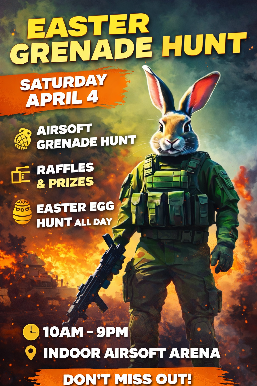 🐰💣 Easter Grenade Hunt is BACK!Join us Saturday, April 4th for a full day of action 🔥 🎯 Grenade Hunt 🎟️ Raffles & Prizes 🥚 Easter Egg Hunt all DayGrab your squad and don’t miss out!🕙 Open 10AM – 9PM 📍 Indoor AirSoft Arena